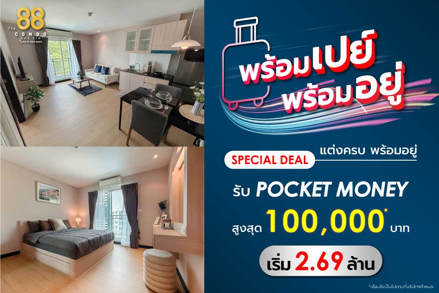 “ดิ 88 คอนโด หัวหิน” โครงการคอนโดสุดหรูบนพื้นที่กว่า 5 ไร่ท่ามกลางธรรมชาติที่สมบูรณ์แบบ ในทำเลที่เงียบสงบและเป็นส่วนตัว รายล้อมไปด้วยสิ่งอำนวยความสะดวกต่างๆ ภายในโครงการอย่างครบวงจร รองรับจำนวนผู้อยู่อาศัยที่เข้ามาใช้บริการได้ครบทุกยูนิต โดยมีให้เลือกจับจองเป็นเจ้าของคอนโดหัวหินทั้งแบบ 1 ห้องนอน, คอนโดหัวหิน 2 ห้องนอน และคอนโดหัวหิน 3 ห้องนอน ภายในถูกตกแต่งด้วยเฟอร์นิเจอร์บิวท์อิน พร้อมกับเครื่องสุขภัณฑ์ในห้องน้ำคุณภาพมาตรฐาน และอุปกรณ์เครื่องใช้ไฟฟ้าต่างๆ ที่เข้าอยู่และใช้งานได้ทันที ห้องทุกประเภทในโครงการได้ถูกออกแบบในสไตล์โมเดิร์นที่ทันสมัย สอดคล้องเข้ากับธรรมชาติรอบนอกได้อย่างลงตัว อีกทั้งพื้นที่ภายในห้องได้รับการออกแบบอย่างใส่ใจทุกรายละเอียด เพื่อให้ทุกพื้นที่เกิดประโยชน์ในการใช้สอยได้อย่างคุ้มค่าในทุกส่วน